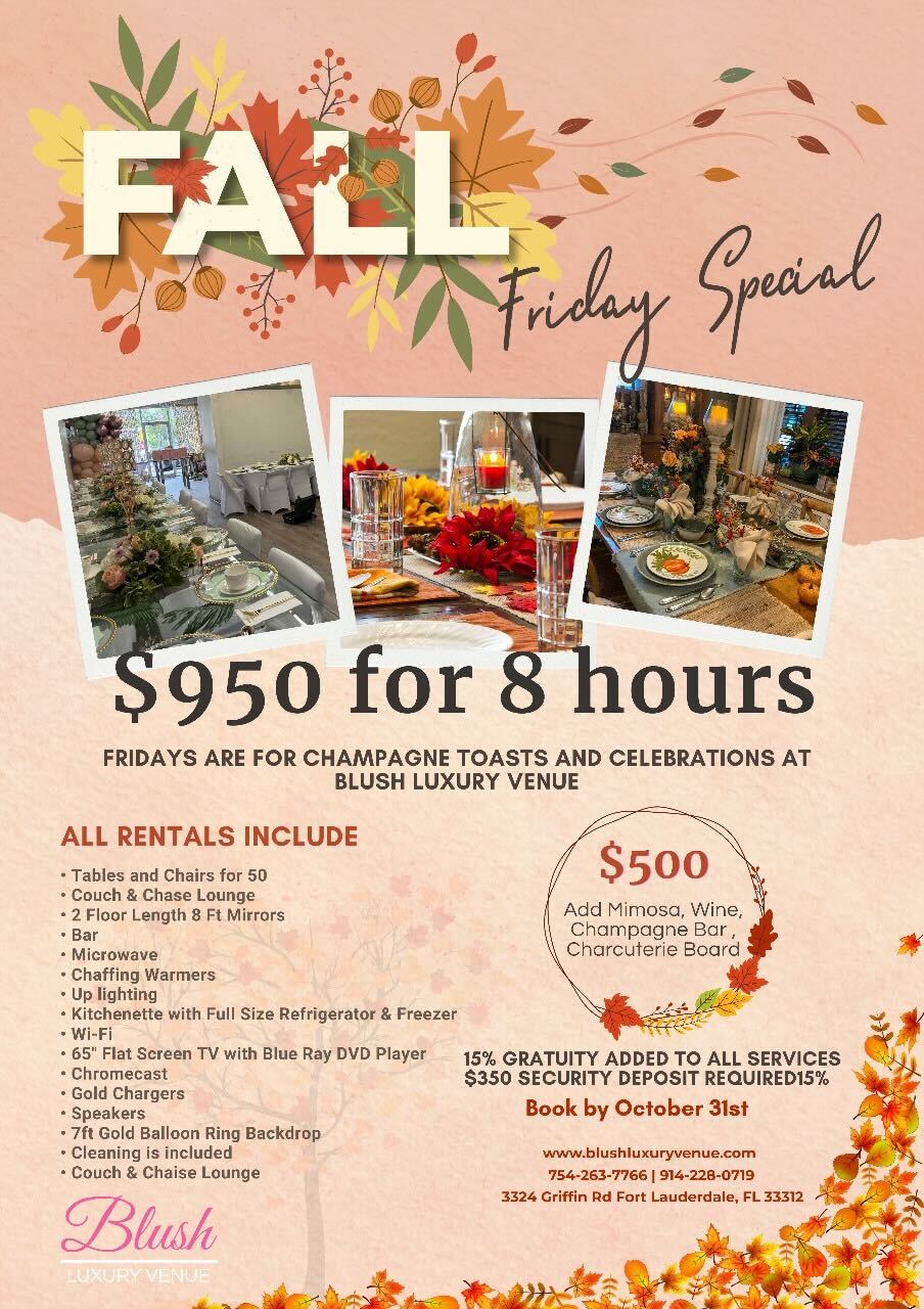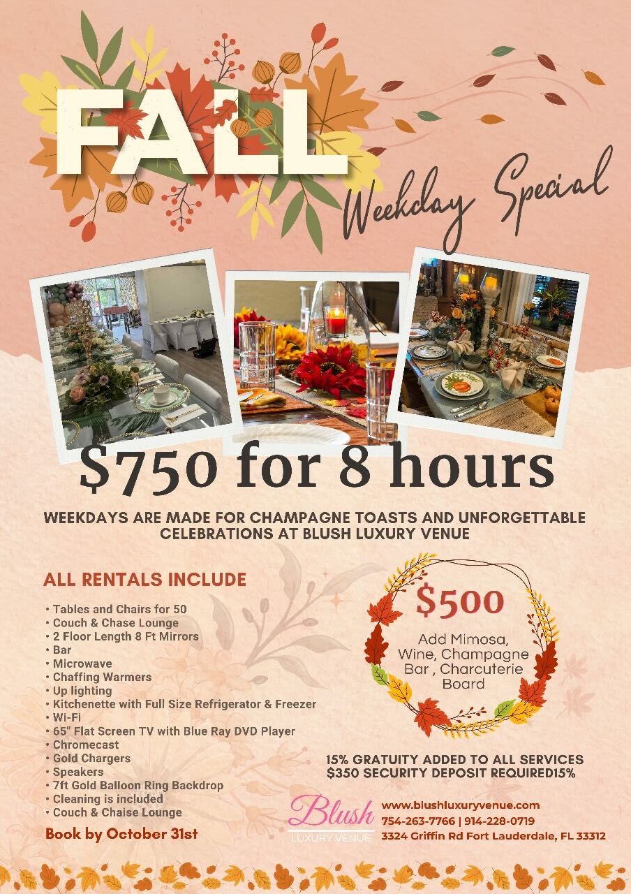 Celebrate your next event in style this season with our exclusive Fall Specials at Blush Luxury Venue, the premier event space in Fort Lauderdale. Whether you’re hosting a wedding, birthday party, baby shower, or corporate celebration, our venue provides an elegant backdrop for unforgettable memories.